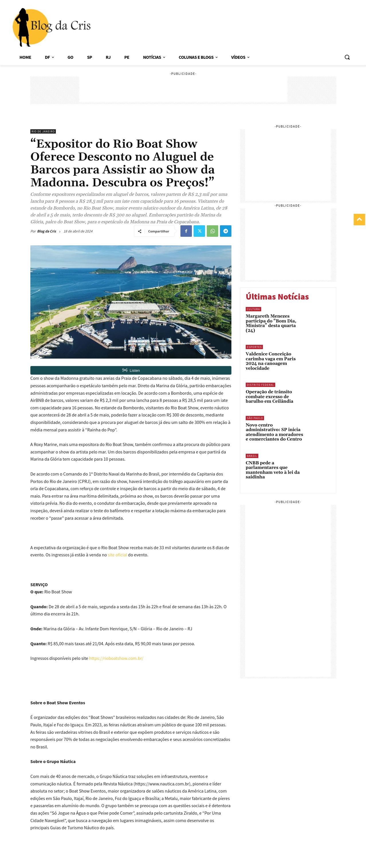 "Expositor do Rio Boat Show Oferece Desconto no Aluguel de Barcos para Assistir ao Show da Madonna. Descubra os Preços!" - Blog da Cris