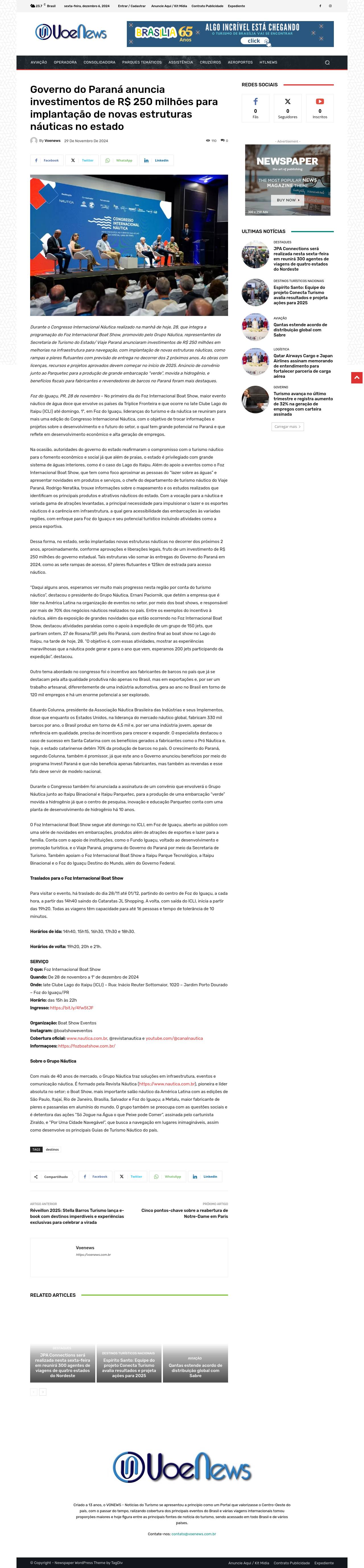 Governo do Paraná anuncia investimentos de R$ 250 milhões para implantação de novas estruturas náuticas no estado - VoeNews - Notícias do Turismo
